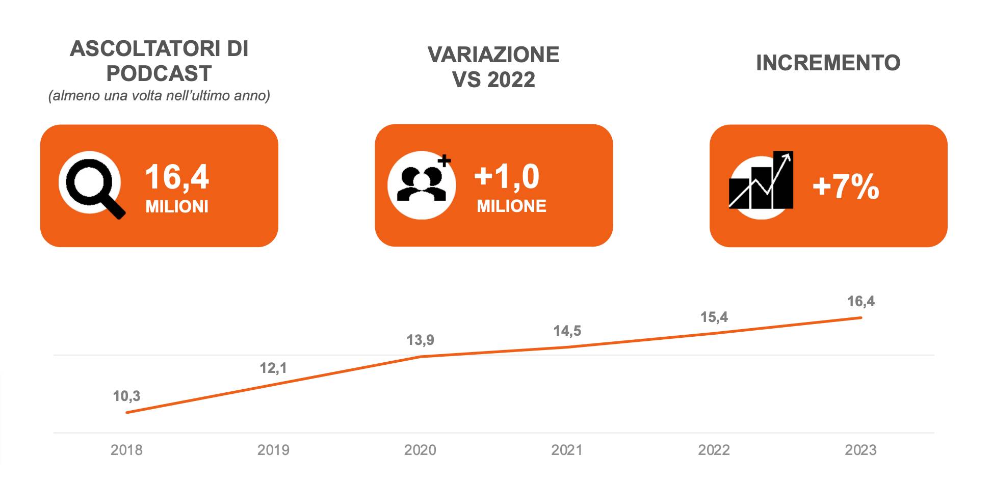 Si tratta soprattutto di giovani, ma il dato interessante è che anche gli over 55 stanno dimostrando un interesse crescente per questo formato, a dimostrazione della trasversalità e del potenziale di intrattenimento e informazione dei podcast per tutti i pubblici e le fasce d’età.